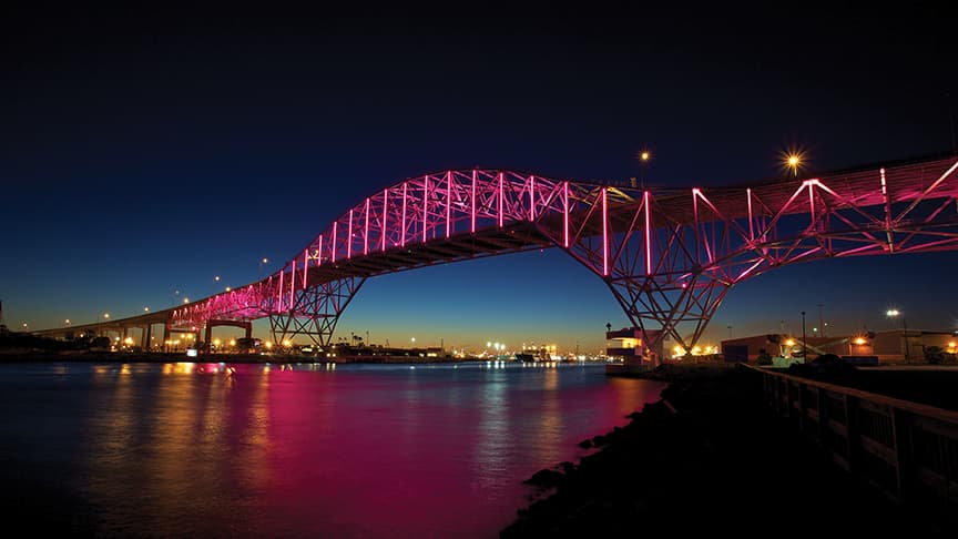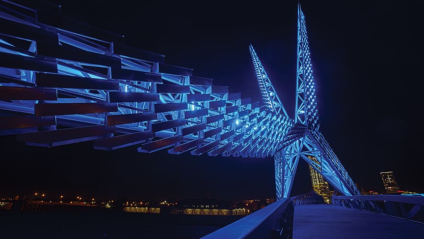我们通过突出结构、质感和设计特色的照明,帮助城市将桥梁改造成视觉地标。 借助先进 LED 技术与色彩控制系统,我们的解决方案可打造引人注目的夜景,改善城市环境,同时与城市建筑特色相得益彰。